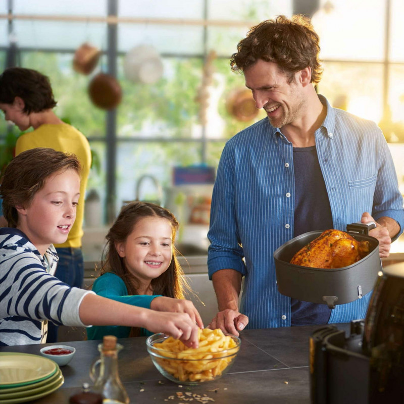 Ναι, μπορείτε να μαγειρέψετε φαγητό για όλη την οικογένεια στο νέο Airfryer XXL. Η πλήρης χωρητικότητά του διευκολύνει το μαγείρεμα ενός μεγάλου, νόστιμου γεύματος. Μπορείτε να μαγειρέψετε ένα ολόκληρο κοτόπουλο ή ακόμα και μέχρι 1,4 κιλό πατάτες για να χορτάσετε την πεινασμένη οικογένεια ή φίλους. Σερβίρετε έως και έξι μερίδες με το μεγάλο τηγάνι χωρητικότητας 7,3 λίτρων.