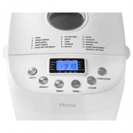 - 15 προγράμματα - βασικό, γαλλικό ψωμί, ολικής αλέσεως, γλυκό, ψωμί βουτύρου, χωρίς γλουτένη, γρήγορο, κέικ, ανάδευση, ζύμη ζύμης, ζύμη ζυμαρικών, γιαούρτι, μαρμελάδα, ψήσιμο, σπιτικό ψωμί (χειροκίνητη ρύθμιση)