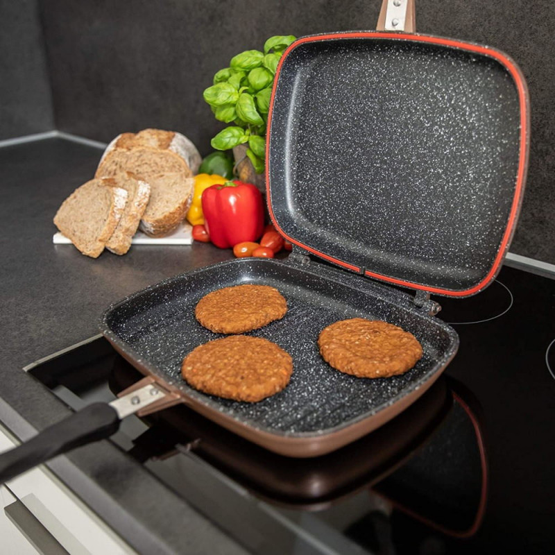 Μπορείτε να το χρησιμοποιήσετε ως κλασικό τηγάνι για τηγάνισμα αυγών, λαχανικών, ψαριών, κρέατος ή να το χρησιμοποιήσετε για ψήσιμο - η επιλογή είναι δική σας! Χάρη στις σφραγίδες σιλικόνης δεν χάνεται η θερμότητα και εξοικονομείτε όχι μόνο ενέργεια αλλά και χρόνο μαγειρέματος!