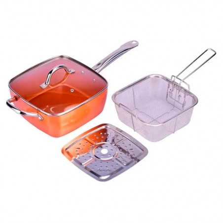 - Διαστάσεις: 24 x 24 x 9 cm - Χωρητικότητα: 5 λίτρα - Αντοχή έως 450°C, επιτρέποντας τη χρήση σε φούρνο - Κατάλληλο για όλους τους τύπους κουζινών - Αντικολλητική επίστρωση - Καινοτόμος σχεδιασμός - Επίστρωση με σωματίδια χαλκού - Διαφανές γυάλινο καπάκι με λαβή για εύκολη παρακολούθηση του φαγητού κατά τη διάρκεια του μαγειρέματος - Αντικολλητική κεραμική επίστρωση - Επαγωγική εστία από ανοξείδωτο ατσάλι - Θερμαίνει γρήγορα και ομοιόμορφα - Μπορεί να μαγειρευτεί χωρίς έλαια και λίπη - Καθαρίζεται εύκολα - Ασφαλές για πλυντήριο πιάτων - Χρώμα: Χαλκός